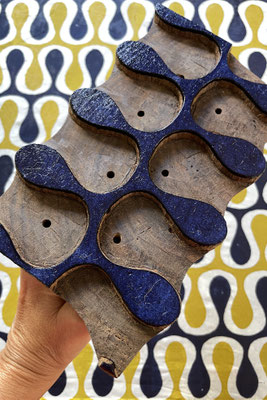 Der Farbstoff setzt sich nur auf den offenen Flächen ab. So entsteht ein Muster durch das Weglassen, eine faszinierende Form des Druckens, die als Reservetechnik (Mud resist Indigo Blockprining) bekannt ist.